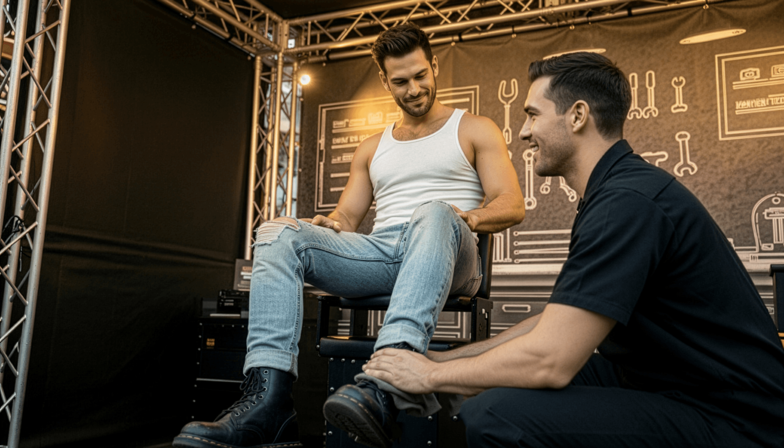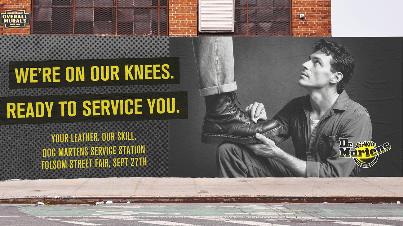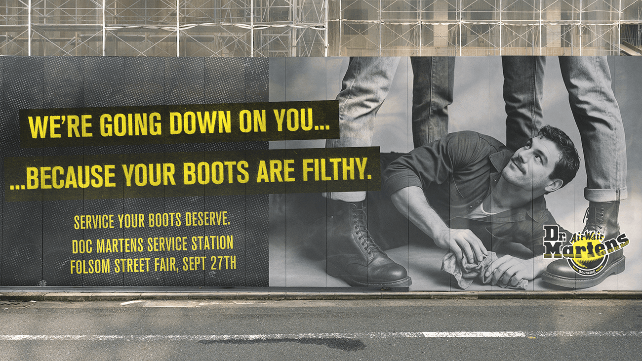 Doc Martens sets up shop at Folsom Street Fair, a bootblack-inspired leather "service station" in the style of a vintage body shop. The booth serves up real boot shines, leather care kits, and "service men" eye candy, inviting festivalgoers to treat leather not just as fashion, but as tradition worth preserving.