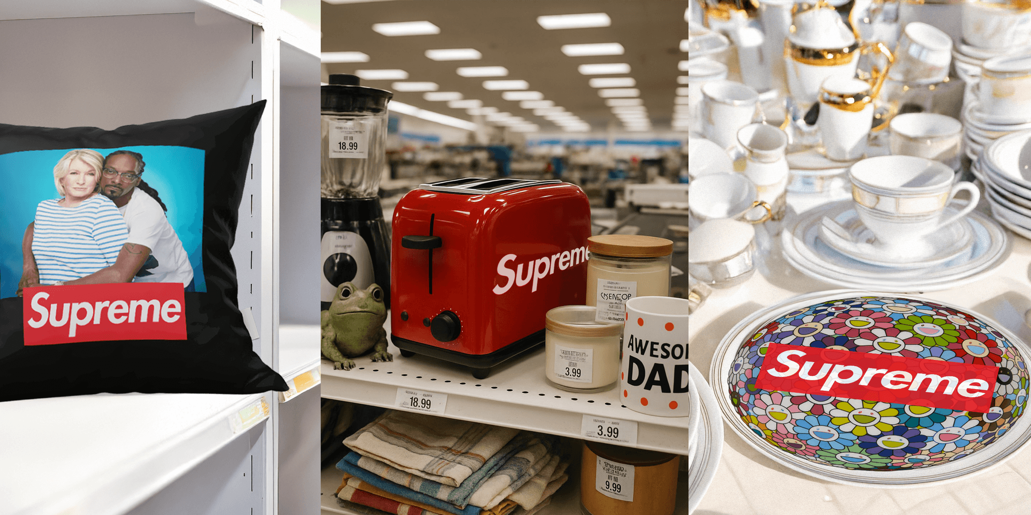 Supreme pulls the ultimate plot twist: hiding its latest limited homeware where hypebeasts fear to tread: Ross Dress for Less. Scattered across shelves, waiting to be found.